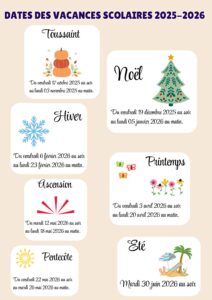 Les dates de vacances sont celles prévues par l’éducation nationale pour la zone A.